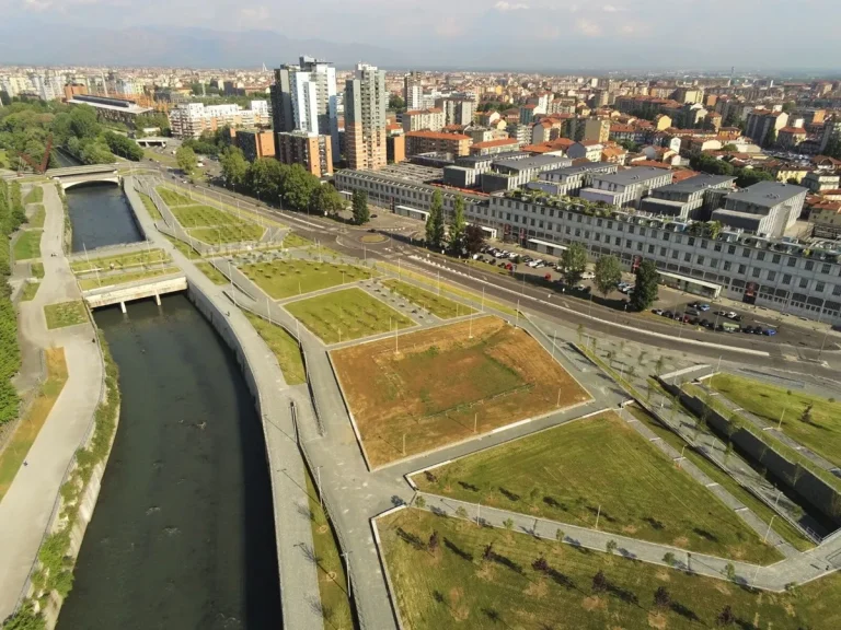 تُعيد تورينو سبينا 3 في إيطاليا تطوير ساحة سكك حديدية صناعية سابقة في شمال تورينو إلى منطقة حضرية مستدامة على مساحة 45 هكتارًا، حيث يُعتبر متنزه البيئة (Envipark) مركزها التكنولوجي الرائد الذي تم إطلاقه في أواخر التسعينيات للابتكار البيئي. وهو جزء من عملية تجديد “العمود الفقري” الأوسع نطاقاً في تورينو، ويمزج بين المساحات الخضراء مثل باركو دورا والمرافق التكنولوجية، ويستضيف الشركات والمختبرات والفعاليات لتعزيز التنافسية من خلال الاستدامة.