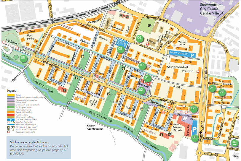 تقوم الاستدامة على تقليل الاستهلاك والتناغم مع الطبيعة. يعمل مفهوم “السيارات المخففة” الناجح على تثبيط ملكية السيارات (حوالي 172 سيارة فقط لكل 1000 ساكن) من خلال نقل مواقف السيارات إلى الأطراف، وتشجيع المشي وركوب الدراجات. وتستخدم المنطقة الإدارة البيئية للمياه مع الرصف القابل للاختراق والمستنقعات الطبيعية، إلى جانب التصميم المناخي الحيوي مثل الأسطح الخضراء والتوجيه الأمثل للمباني للتدفئة السلبية.