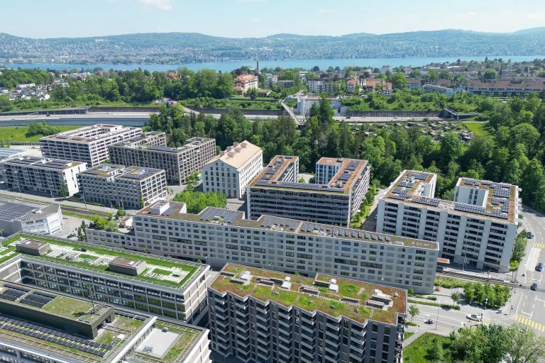 مدينة زيورخ الخضراء هي منطقة حضرية مستدامة رائدة تقع في جنوب غرب زيورخ بسويسرا، بالقرب من وادي سيهل وسفوح جبل أويتليبرغ. تمتد المدينة الخضراء على مساحة 8 هكتارات تقريباً، وهي تجسد مبادئ “مجتمع 2000 واط” الذي يهدف إلى الحد بشكل كبير من استهلاك الطاقة وانبعاثات الكربون. تدمج المنطقة بين المساحات السكنية والمكتبية والتجارية والعامة، مما يخلق مجتمعاً متعدد الاستخدامات نابض بالحياة مصمم لاستيعاب حوالي 2,200 ساكن و3,000 وظيفة.