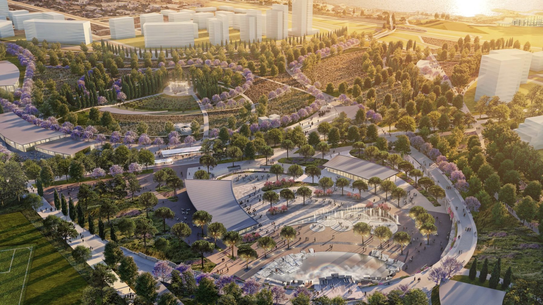 Das Projekt konzentriert sich auf die ökologische Wiederherstellung, indem Tausende von Bäumen und einheimischen Pflanzen gepflanzt werden, um den ehemaligen Flughafen in einen blühenden Korridor der Biodiversität zu verwandeln. Es verfolgt einen Ansatz der Kreislaufwirtschaft, indem es alte Start- und Landebahnen wiederverwendet und für die Bewässerung auf aufbereitetes Wasser zurückgreift. Klimaresistente Elemente wie Regengärten und bioklimatisches Design helfen, Stürme zu bewältigen und die städtische Hitze zu reduzieren.