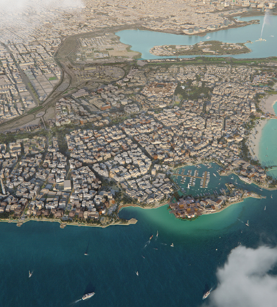 Die Jeddah Waterfront Regeneration belebt die Küstenlinie der Stadt am Roten Meer durch zwei Schlüsselprojekte: die Historic Jeddah Waterfront, die den UNESCO-geschützten Al-Bunt-Hafen mit Grünflächen und kulturellen Stätten wiederherstellt, und MARAFY, eine neue Kanalstadt mit einer 11 km langen Wasserstraße für gemischte Wohnnutzung. Beide Initiativen stehen im Einklang mit der saudischen Vision 2030, die die Erhaltung des kulturellen Erbes mit moderner Stadtentwicklung verbindet, um den öffentlichen Zugang und das Gemeinschaftsleben zu verbessern.