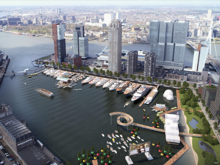 Rijnhaven liegt am Südufer der Nieuwe Maas, zwischen Wilhelminapier und Katendrecht, wo ein großer Teil des Hafenwassers aufgeschüttet werden soll, um neues Land zu schaffen. Der Plan umfasst 2.000-3.000 Wohnungen, Hochhäuser, Büros und einen 18 Hektar großen schwimmenden Stadtpark. Ein wichtiges Merkmal ist die Umwandlung der historischen Codrico-Fabrik in ein Kultur- und Wohnzentrum, das eine begehbare Schleife um den Hafen bildet.