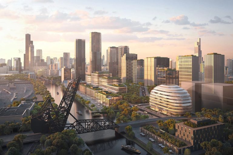 Die Nachhaltigkeit ist von grundlegender Bedeutung. Dazu gehören ausgedehnte Grünflächen, die Wiederherstellung des Flussufers, energieeffiziente Gebäude und Einrichtungen, die alternative Verkehrsmittel wie das Fahrrad und den öffentlichen Nahverkehr fördern. Der Entwurf berücksichtigt die Reduzierung der städtischen Wärmeinsel, das Regenwassermanagement und die Reduzierung des CO2-Fußabdrucks im Einklang mit den Klimazielen Chicagos.