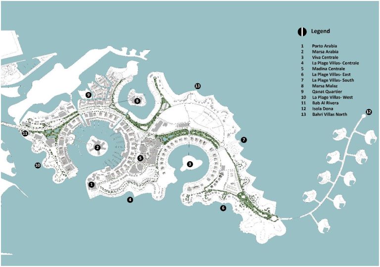 The Pearl Island umfasst etwa 27.000 Wohneinheiten in 12 architektonisch unterschiedlichen Bezirken. Sie bietet Luxuswohnungen, Yachthäfen, Einzelhandelsgeschäfte, Unterhaltungsmöglichkeiten, Parks und Uferpromenaden. Das Design schafft ein Gleichgewicht zwischen Großartigkeit und Lebensqualität und bietet malerische Küstenabschnitte mit 32 Kilometern Strand und erstklassigen Annehmlichkeiten. Die Siedlung ist eine Freehold-Zone, die es Ausländern erlaubt, Eigentum zu erwerben und so eine globale und vielfältige Gemeinschaft zu fördern.