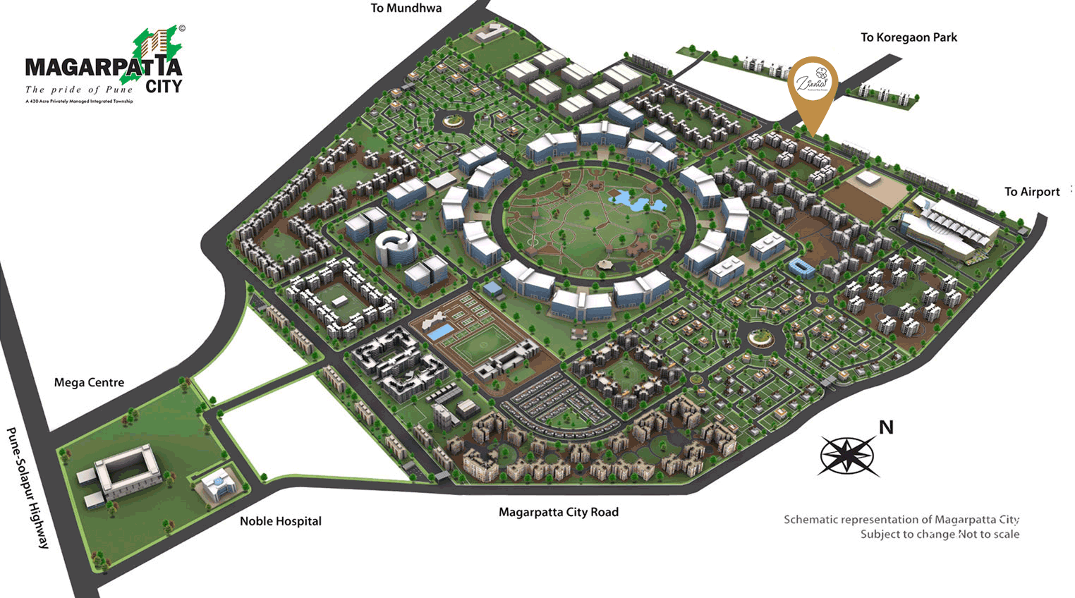 Magarpatta fue creada por un colectivo de agricultores locales que transformaron sus tierras agrícolas en un municipio integrado, fomentando un nuevo modelo urbano en la India. La ciudad presenta una variedad de opciones de vivienda apartamentos, casas en hilera y bungalows, junto a oficinas comerciales, centros comerciales, hospitales, escuelas y servicios comunitarios, todo ello dentro de una zona segura y bien comunicada. Encarna una mezcla de trabajo, vida y ocio dentro de un entorno verde y sostenible.