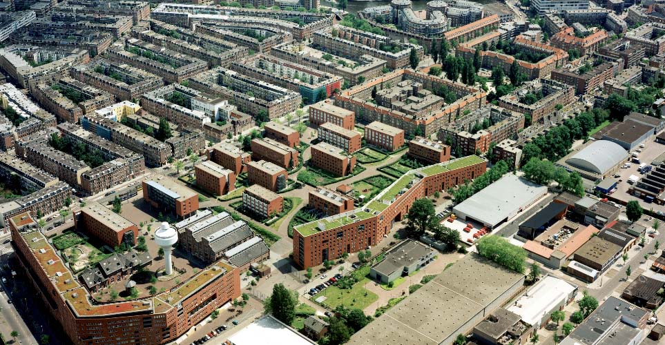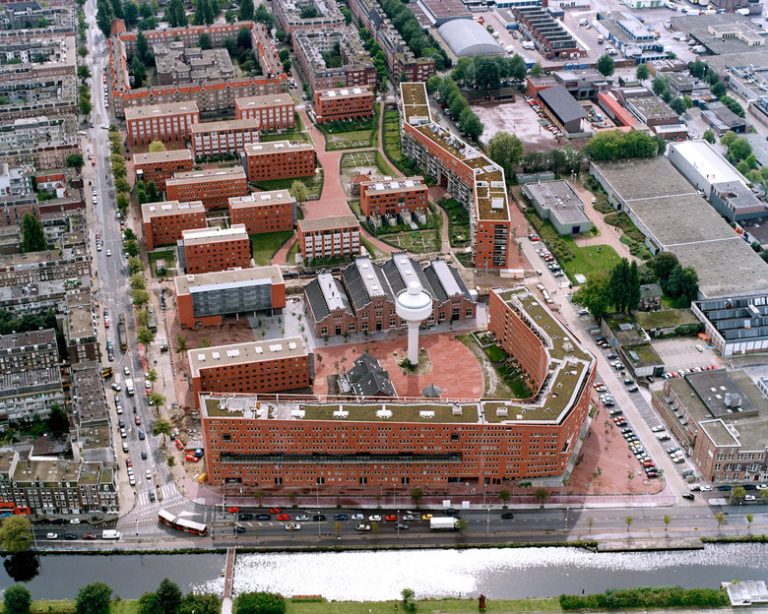 Il GWL Terrein ad Amsterdam Ovest si estende per circa 6 ettari ed è un quartiere ecologico ad alta densità con circa 600 abitazioni per 1.400-1.800 residenti. Progettato da Kees Christiaanse, fonde 17 nuovi blocchi abitativi con edifici storici conservati, come la vecchia torre dell’acqua. L’area comprende sia unità in affitto sociale che case occupate dai proprietari, per mantenere una comunità diversificata.