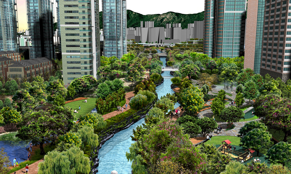 La sostenibilità è parte integrante: si prevede che il solo sistema di teleraffreddamento risparmi circa 100.000 tonnellate di emissioni di CO₂ all’anno, grazie alla riduzione del consumo di elettricità. La rete di spazi aperti, i parchi e il corridoio fluviale sono progettati per migliorare l’ecologia urbana, fornire accesso pedonale, ridurre gli effetti delle isole di calore e sostenere la resilienza climatica.