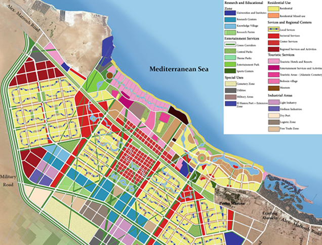 La città si trova sulla costa settentrionale dell’Egitto, all’interno dei confini amministrativi del Governatorato di Marsa Matrouh. Si estende per circa 48 km lungo la strada costiera Alessandria-Marsa Matrouh. La città è uno sviluppo multifase con zone distinte: un’area turistica con resort e hotel di lusso, un distretto amministrativo e commerciale centrale. È stata progettata per creare un nuovo corridoio economico, fungendo da modello per la futura espansione urbana dell’Egitto.