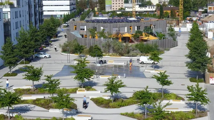 バーンシュタットの中核となるコンセプトは、すべての建物に厳格なパッシブハウスを採用し、暖房エネルギーを50〜80%削減すること。残りのエネルギー需要は、主に木材チップを利用したCHPプラントによる100%自然エネルギーで賄われています。また、洪水リスクを低減するため、屋上緑化や高度な雨水管理も行われています。