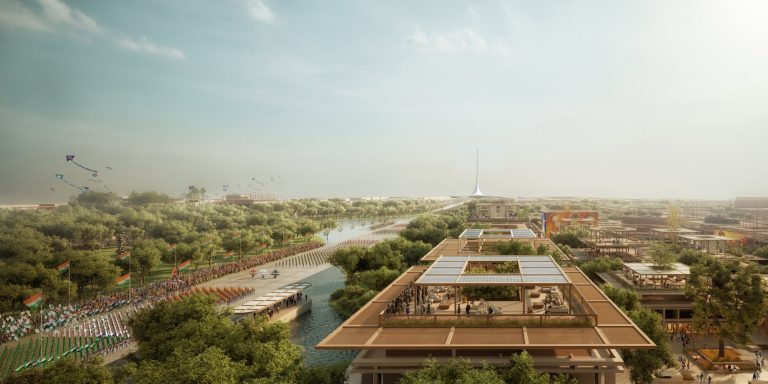 도시 비전의 초석은 환경에 대한 헌신입니다. 아마라바티는 10%의 녹지-청색 공간이라는 국가적 기준과 달리 전체 면적의 60%를 녹지와 물로 확보했습니다. 여기에는 광범위한 공원, 아름다운 크리슈나 강변, 네덜란드의 전문성을 바탕으로 설계된 홍수 완화를 위한 “스펀지 도시” 접근 방식이 포함됩니다. 모든 건물은 엄격한 친환경 기준을 준수하도록 의무화되어 있습니다.