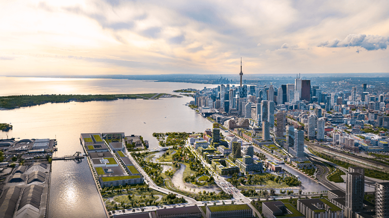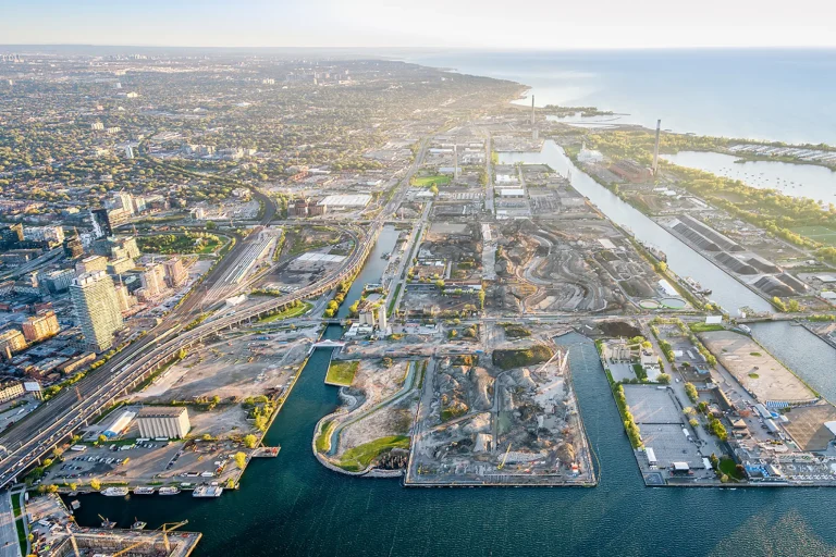 Портовые земли Торонто — это крупный проект по возрождению города, в рамках которого около 355 гектаров неиспользуемых промышленных земель к юго-востоку от центра Торонто будут превращены в устойчивое, жизнеспособное сообщество со смешанным использованием. Центральным элементом этой инициативы является создание острова Вильерс, который теперь известен как Ооквемин Минисинг, — острова, образовавшегося в результате восстановления естественного состояния устья реки Дон.