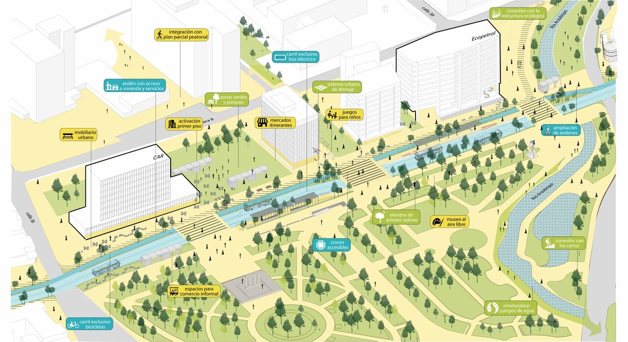 โครงการ "Corredor Verde" ของโบโกตาเป็นแผนฟื้นฟูเมืองครั้งใหญ่ เริ่มต้นด้วยการเปลี่ยนเส้นทาง Carrera Séptima ระยะทาง 22 กิโลเมตร ขณะเดียวกัน โครงการรถไฟฟ้าสายใหม่กำลังก่อสร้างในรูปแบบ "DOTS" (Transit-Oriented Development) โดยใช้สถานีเป็นศูนย์กลางในการฟื้นฟูย่านต่างๆ และสร้างชุมชนที่มีการใช้งานแบบผสมผสานที่หนาแน่น มากขึ้น โครงการนี้เกี่ยวข้องกับการออกแบบภูมิทัศน์ถนนใหม่ทั้งหมดเพื่อสร้างทางเดินที่ปลอดภัย เป็นมิตรกับสิ่งแวดล้อม และเข้าถึงได้สะดวก รวมถึงโครงสร้างพื้นฐานสำหรับปั่นจักรยาน ควบคู่ไปกับการติดตั้งระบบไฟฟ้าให้กับรถโดยสารประจำทางที่ได้รับการสนับสนุนจากระบบรถไฟฟ้าสายใกล้เคียงใน Usme และตามแนวเส้นทาง NQS