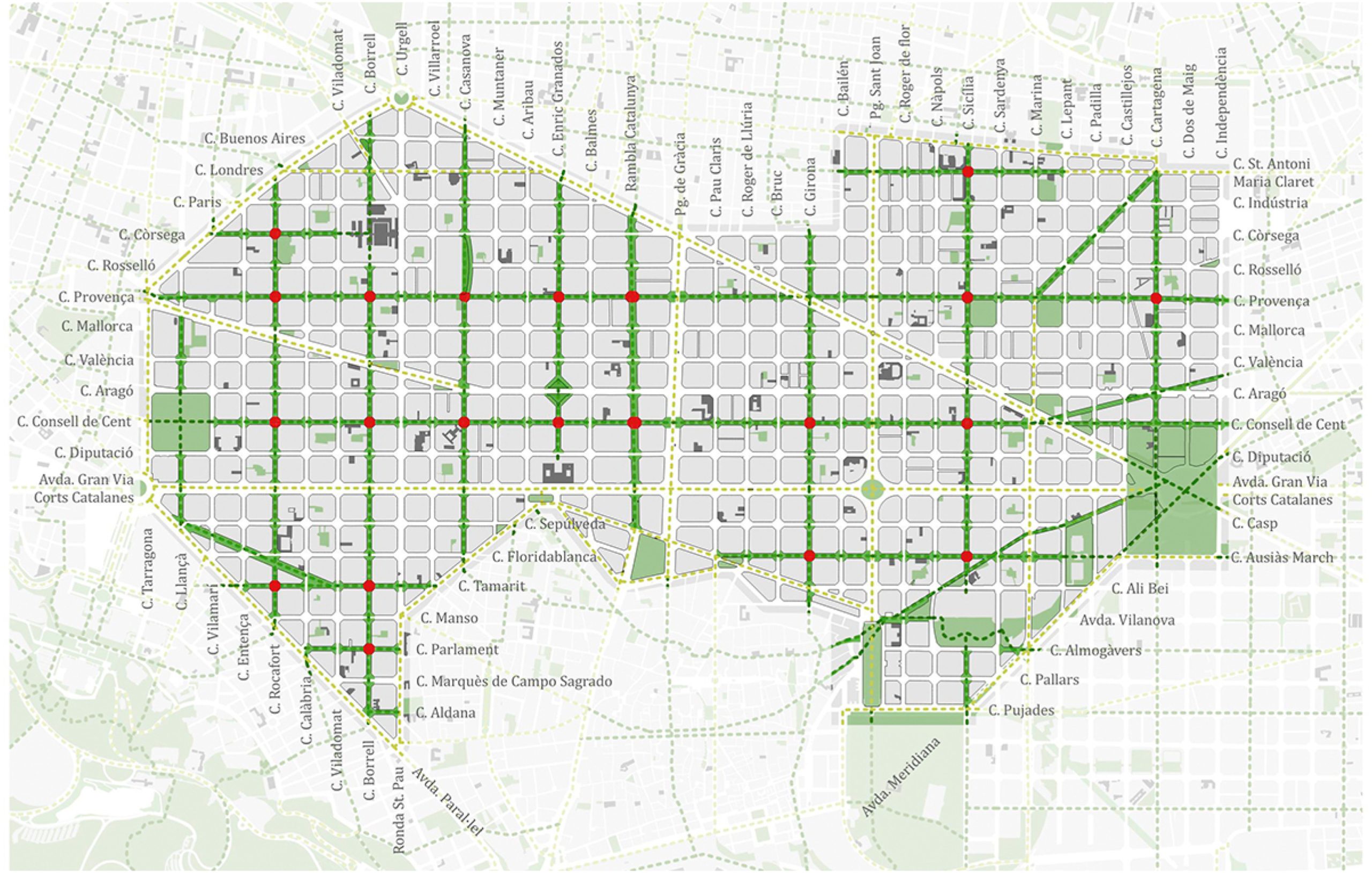 โครงการ Superblocks (Superilles) ของบาร์เซโลนา มีเป้าหมายเพื่อฟื้นฟูพื้นที่สาธารณะในเขต Eixample ด้วยการลดปริมาณการจราจรทางรถยนต์และให้ความสำคัญกับคนเดินเท้า พื้นที่สีเขียว และวิถีชีวิตท้องถิ่น โครงการนี้นำโดยสภาเมืองบาร์เซโลนา โดยเปลี่ยนถนนให้เป็นพื้นที่สีเขียวที่สามารถเดินได้ เพื่อบรรเทาปัญหาการจราจร มลพิษ และเพิ่มพื้นที่สีเขียวในเขตเมืองที่มีความหนาแน่นสูงแห่งนี้